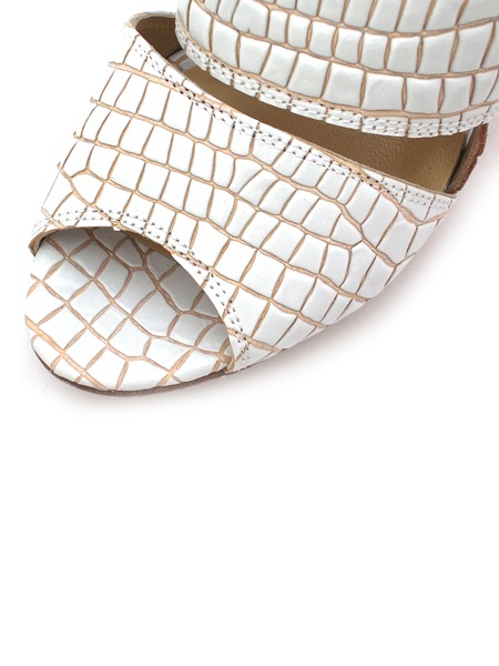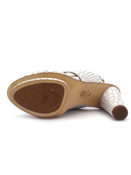 Необычные и оригинальные босоножки нежного молочного цвета с имитацией под питона. Босоножки на внешней платформе. Каблук обтянут кожей в тон.