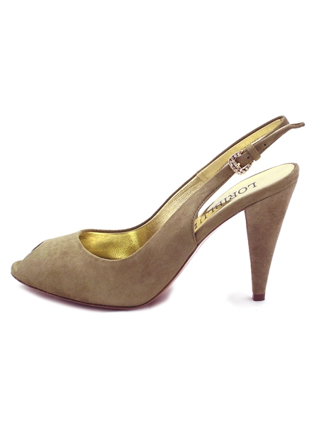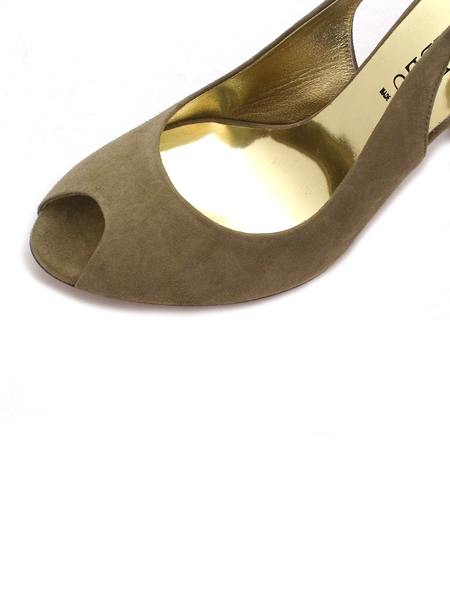 Материал: верх - натуральная замша серо-бежевого темного цвета, подкладка - телячья золотистая кожа; низ - подошва из натуральной кожи с резиновой профилактикой. Каблук 10 см.
