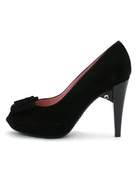 Милые женственные туфли-лодочки глубокого черного цвета. Мыс открытый, декорирован розочкой из замши в тон. Колодка удобная, каблук устойчивый. Утонченная и изящная модель.