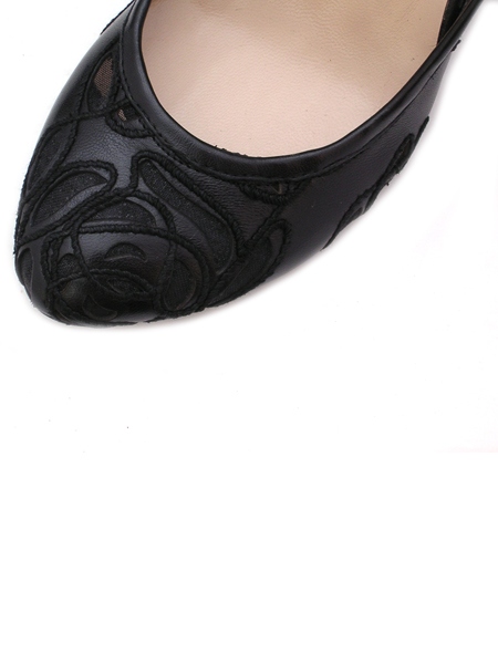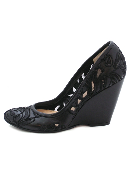 Женственные и аккуратные туфли на танкетке. Колодка очень удобная и устойчивая. Туфли декорированы ручной вышивкой в технике ришелье, что является модным трендом сезона 2009.