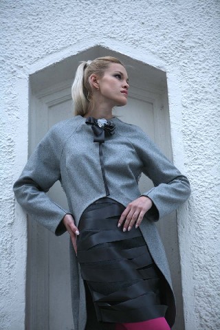 Юбка- карандаш, спереди задрапирована лентами различной длины.