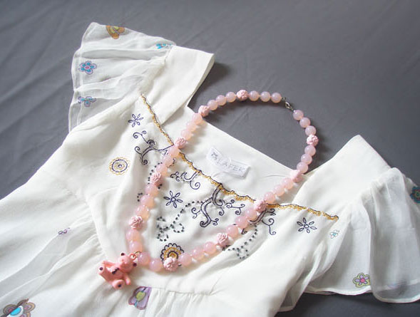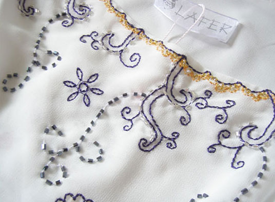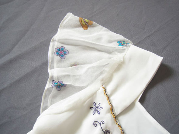 Платье двуслойное, нижний слой из непрозрачного белого шелка, что препятствует "прилипанию" и делает модель более романтичной.