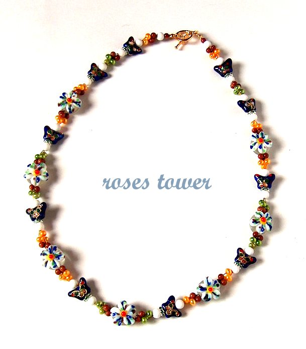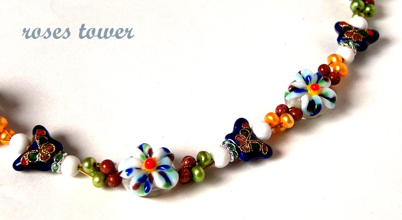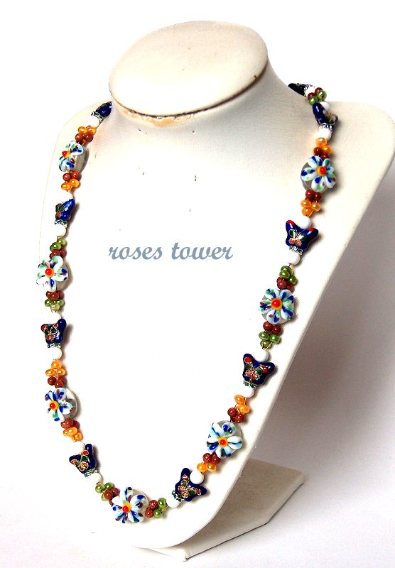 Бусины лэмпворк, эмалевые бабочки, крашенный речной жемчуг, авантюрин, имитация белого агата, стразы, позолоченный замочек-тогл.