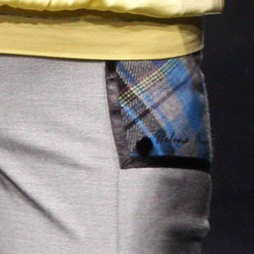 Боковые карманы выполнены из ткани в голубую клетку.