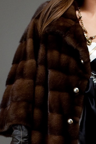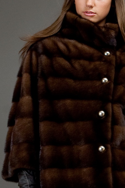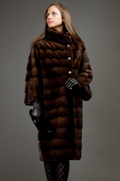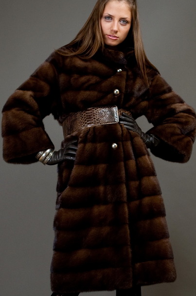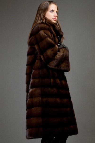 Шуба классического силуэта, создана из меха горизонтальной раскладки, смотрится очень роскошно из за сходства цвета меха с цветом шкурок драгоценного соболя.