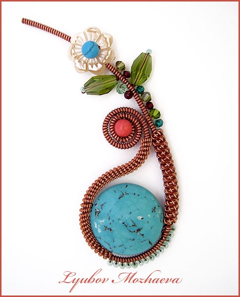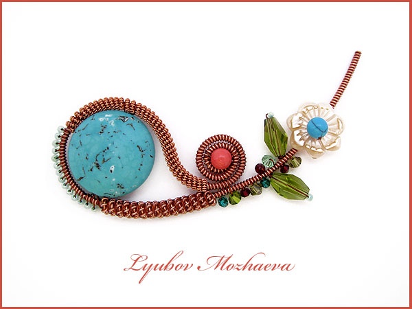 Пришивная брошь, выполненная из медной проволоки, бирюзы, коралла, перламутра и кристаллов Swarovski.