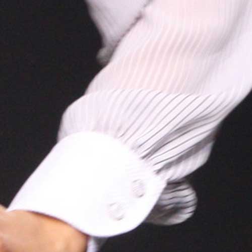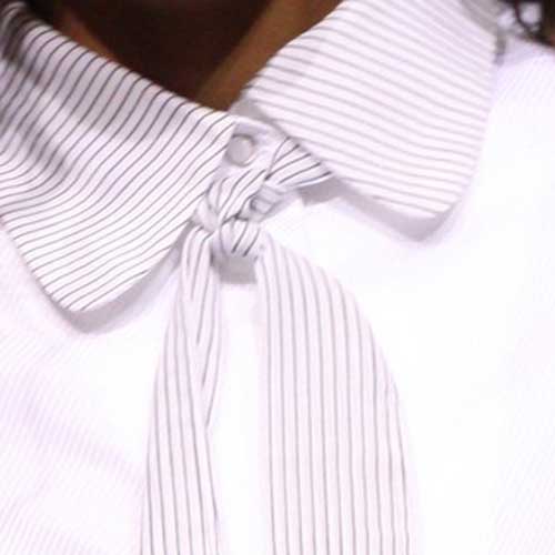 Воротник отложной с закругленными уголками. Воротник, галстук и нижняя часть рукава выполнены из ткани в тонкую полоску.