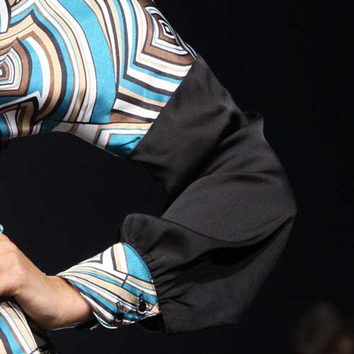 Воротник блузы отложной. Ворот, галстук и нижняя часть рукава выполнены из ткани контрастного черного цвета.