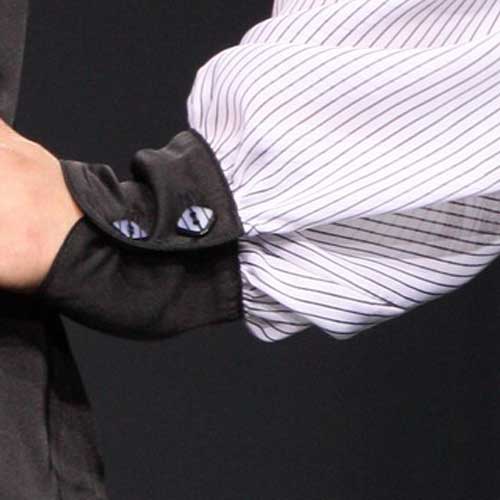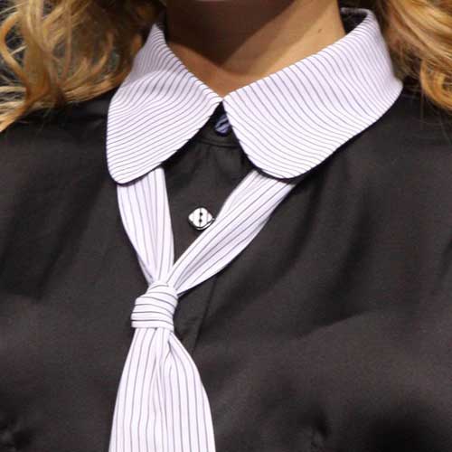 Воротник отложной с закругленными уголками. Воротник, галстук и нижняя часть рукава выполнены из ткани в тонкую полоску.