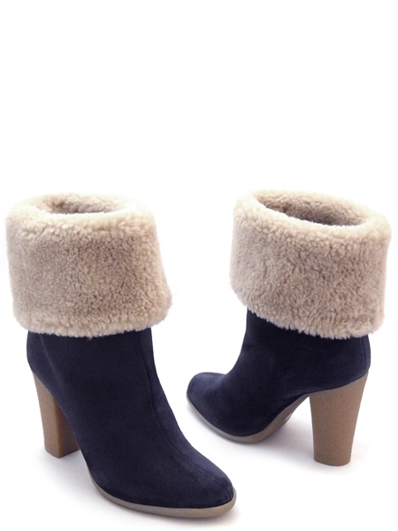 Ботильоны на устойчивом каблуке, светлый цвет подошвы идеально гармонирует с молочным цветом меховой подкладки.