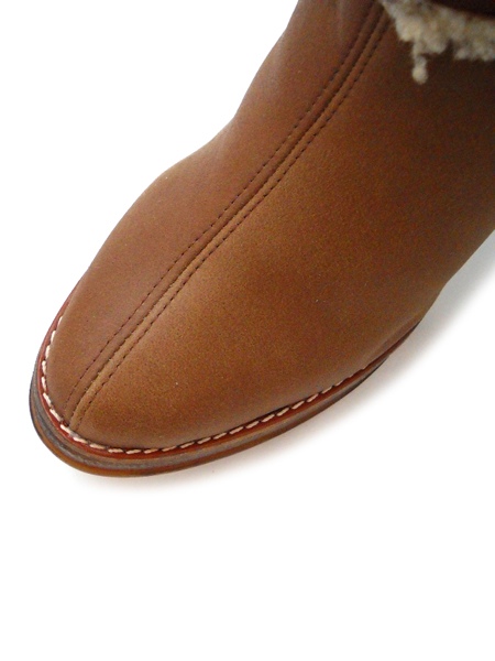 Материал верха: дубленочная кожа с мехом ( мутом) средне-коричневого цвета. Светлый мех. Голенище типа труба. Высота голенища 38см (+10 см манжет)