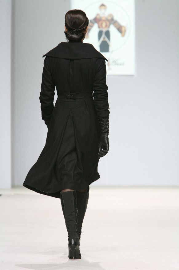 Эту модель рекомендуется носить с удлиненными черными перчатками и высокими сапогами.