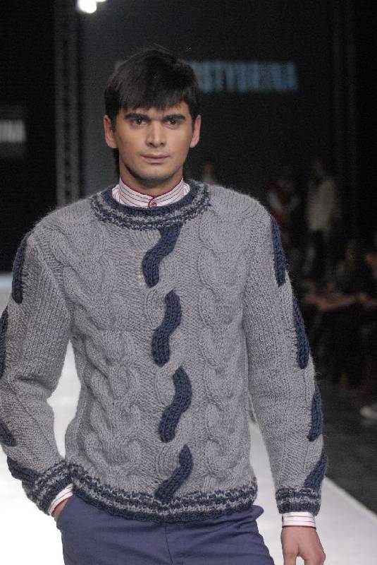 Стильный теплый мужской свитер сдержанного серого оттенка. Свитер с орнаментальным рисунком, деко-рирован вставками контрастного темно-синего цвета. Удобная и комфортная модель.