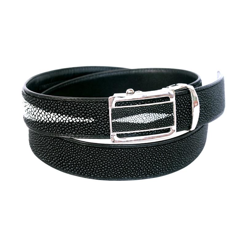Поэтому к строгому мужскому костюму рекомендуем выбрать ремень из кожи ската черного цвета.