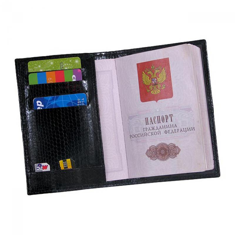 Обложка для паспорта выполнена из кожи змеи благородного черного цвета и имеет: