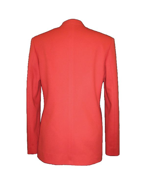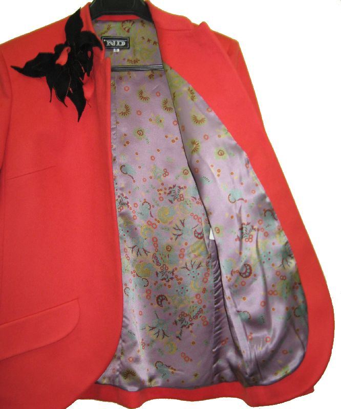 Пиджак с небольшим воротником - стойкой, двумя боковыми прорезными карманами, на шелковой подкладке.