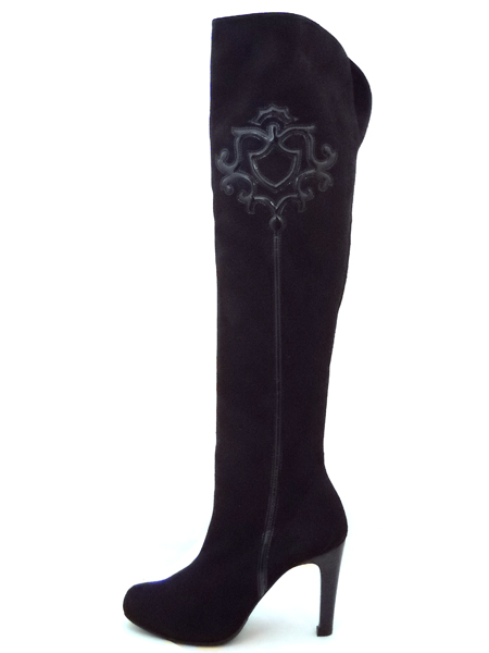 Ботфорты из натуральной замши-стрейч, с орнаментом из лакированной кожи.