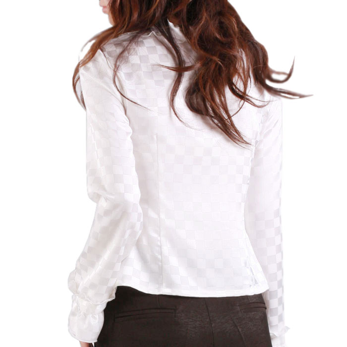 Офисная блуза классической длины из атласной ткани в оригинальном исполнении: немного расклешённый в манжете рукав, вырез горловины оформлен рюшей, переходящей в обтачку полочки. Застёжка на мелкие перламутровые пуговицы. Модель выполнена из ткани "клетка": матовые клеточки чередуются с атласными. Вытачки на полочке и спинке образуют приталенный силуэт и обеспечивают комфортную посадку по фигуре.