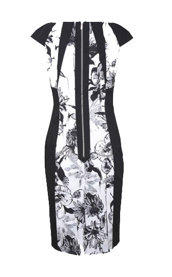 "Скульптурное" платье, предназначенное для того, чтобы вылепить любую фигуру в стройный силуэт. Такой эффект достигается путём сочетания двух основных контрастных цветов - чёрного и белого. Цветочный рисунок на белом фоне не даёт модели быть скучной, а классическая форма кроя делает её поистине элегантной. Отрезная линия под грудью, рельефные швы, рукавчики-реглан с защипами и оригинальное оформление выреза горловины - вот секреты успеха этой модели.