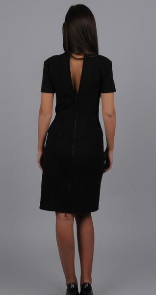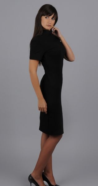 Элегантное и необычное платье с воротником-стойкой незаменимо в офисе. Вместе со всей строгостью и некоторой скромностью этого наряда пикантности ему придает молния и вырез на спине в форме буквы V. Воротник-стойка и небольшой разрез спереди не позволяют платью выглядеть скучно. Даже в трудовые будни в этом наряде вы всегда будете выглядеть стильно и очаровательно.