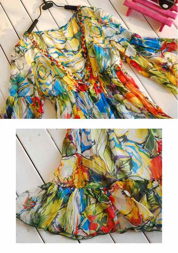Яркое пестрое платье с модными широкими рукавами из тонкого нежного шелка.