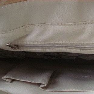 Модель выполнена из плотного текстиля, дополненного кожаными вставками, закрывается на молнию, снабжена подкладкой и кармашками. Сумку можно носить в руках или на плече.