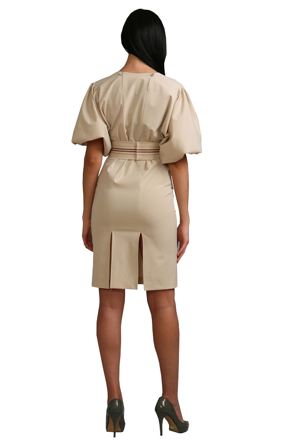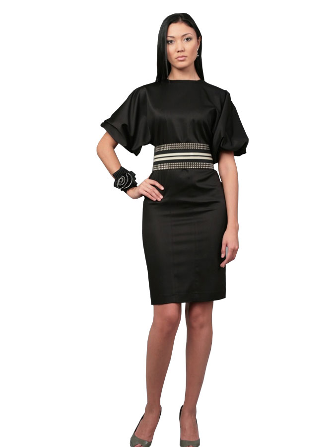 Эффектное платье с рукавом-фонарь и горловиной "лодочка" поражает своим аскетизмом в сочетании с нежностью и романтичностью. Единственная броская, а оттого ещё более значимая деталь - пояс, декорированный разнофактурной тесьмой - подчёркивает талию, а облегающая юбка рисует стройный силуэт, не сковывая движений.