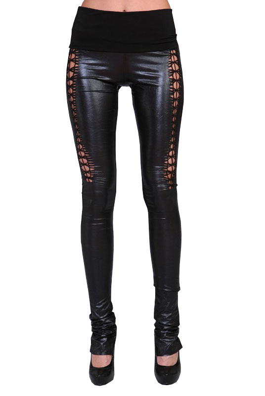 Лосины из трикотажа с эффектом кожи, расклешенные книзу, хороши в качестве компаньона к туникам и свитерам и непременно понравятся современной моднице. Драпирующийся пояс и кружевное плетение по бокам - эффектные детали, которые выделяют изделие из ряда подобных. Лосины отлично подчеркнут Ваши стройные ножки и будут незаменимы в прохладную погоду.