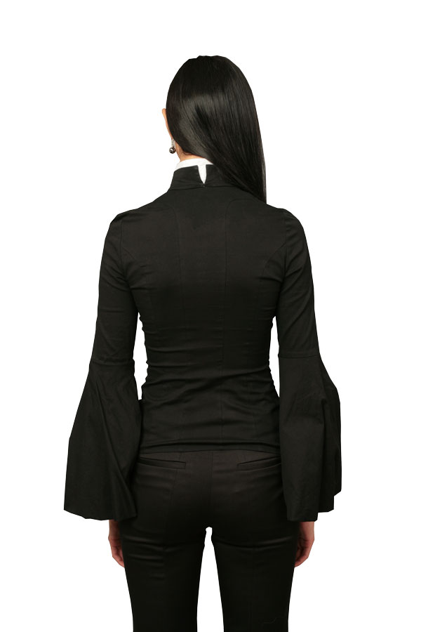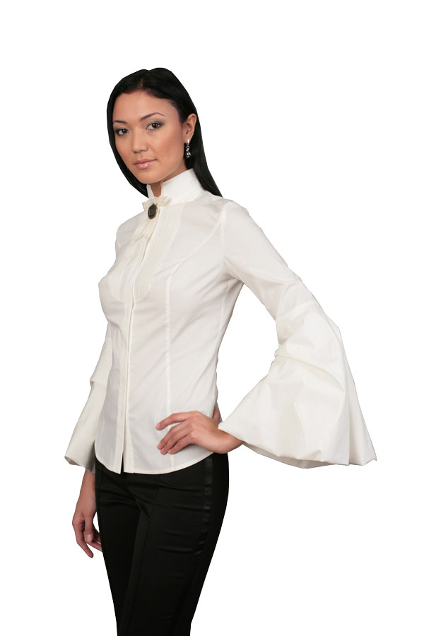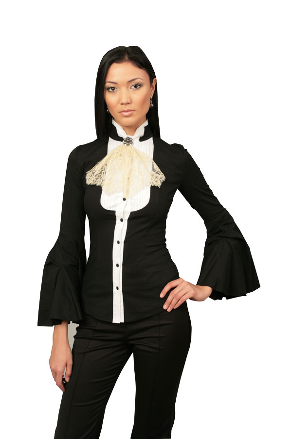 Великолепное вечернее решение от Shumilo&Elagina: блуза с двойным воротником и кружевной манишкой в складку, декорированной брошью. Благодаря приталенному силуэту в сочетании с рукавами, украшенными объемными декоративными манжетами, эта модель превосходно подчёркивает изящный силуэт и делает стройной любую фигуру.