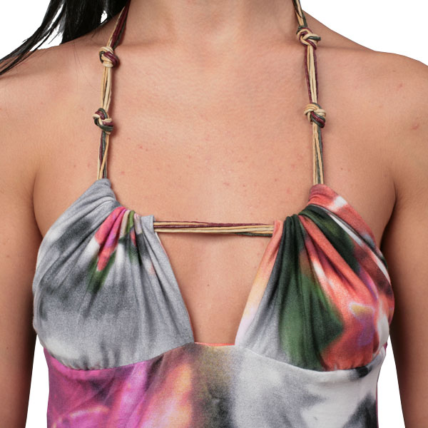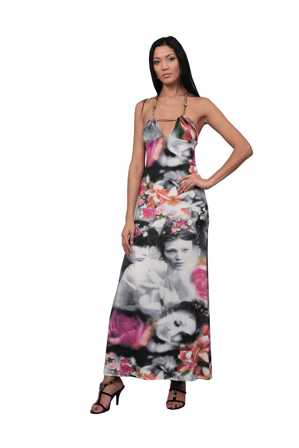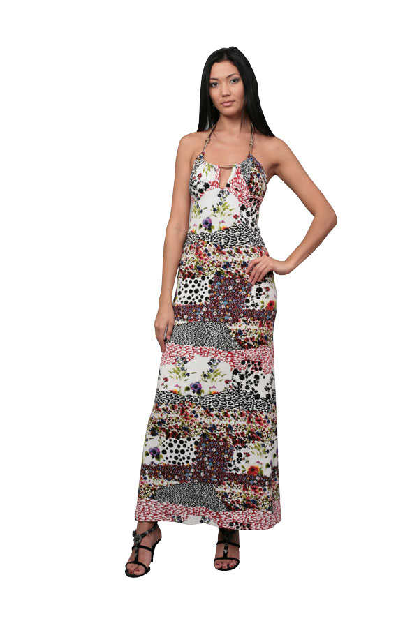 Длинный сарафан из нежной вискозы хорош и для повседневной носки, и для вечернего выхода знойным летом. Лиф со сборкой на бретелях из кожаной тесьмы с узелками и макси-длина отсылают нас к этническим мотивам, а графичный принт в виде огромного распустившегося цветка напоминает о том, что модель создана в эпоху компьютерных технологий, а потому придётся по вкусу любой современной барышне.
