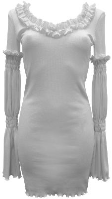 Белое трикотажное платье с отделкой по краям выглядит обаятельно, привлекательно и игриво. Оригинальные рукава в стиле кармен. Модель из коллекции BLACK&WHITE / CASUAL.