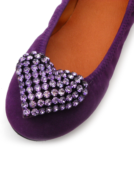 Блеском и изяществом эти балетки ничуть не уступают вечерним туфлям. Сочный модный цвет и ссердечко из стразов на несколько тонов светлее делают эту обувь обворожительной. Круглый мыс и проложенная по периметру верхней части балеток резинка позволяют модели очень удобно сидеть на ножке любой модницы.