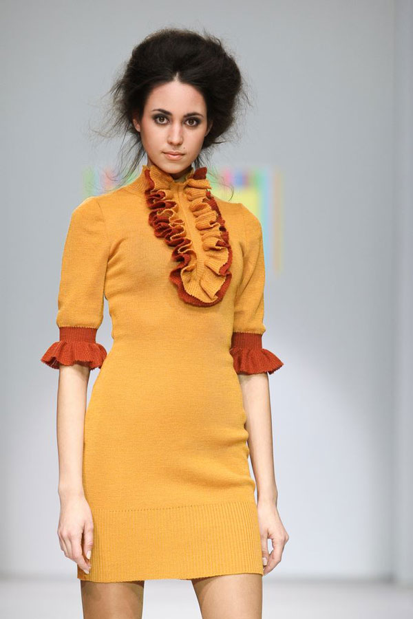 Цвет охра-очень приятен. Он не так ярок, как желтый, и не так мрачен, как коричневый. Поэтому в своей коллекции осень-зима 2010/2011 дизайнер Евгения Родович (LeGerJe) выбрала телый, природный цвет для этого трикотажного платья.