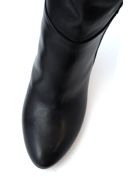 Материал верха: черная телячья кожа. Подкладка - светлая нат. кожа. Молния сбоку, высота голенища сзади 39см, спереди голенище выше на 4см.