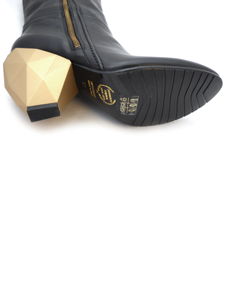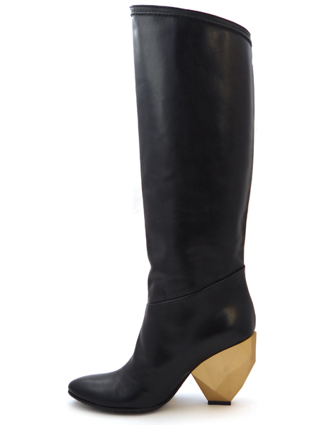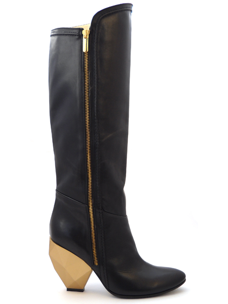 Яркие оригинальные сапоги из последней коллекции итальянской марки Sergio Amaranti из телячьей кожи привлекают внимание необычным "золотым" каблуком. Массивный каблук выполнен в форме многоугольника, дополнением к нему идет "золотая" молния. Индивидуальности сапогам придает также разная высота голенища спереди и сзади.