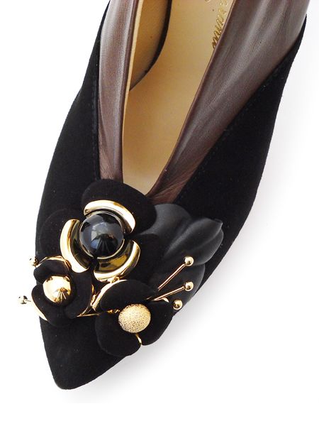 Вечерние замшевые туфли - само изящество. Глубокое декольте из кожи в сочетании с основным материалом - замшей напоминает вырез элегантного платья, и так же, как предполагаемое платье, украшено роскошной брошью в виде черного с золотом цветка.