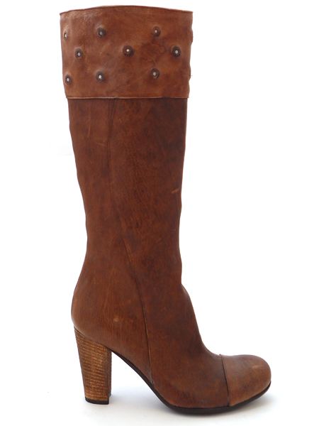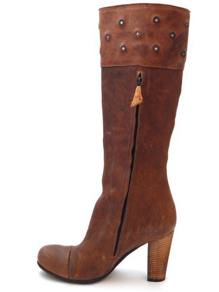 Яркие винтажные сапоги с эффектом состаренной кожи привлекут внимание к вашей персоне. Эффект состаренности имеет даже материал подошвы. Клепки по верху голенища добавляют яркости этой паре. Удобная колодка, каблук 8,5 см.