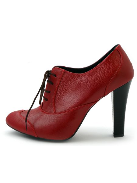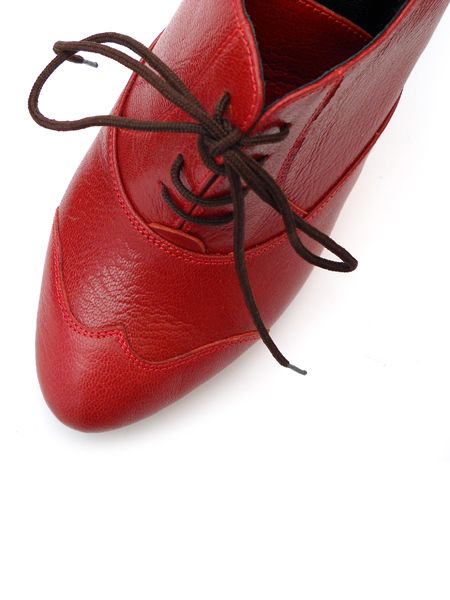 Красные кожаные ботильоны сделают любой, даже самый скучный наряд ярким и интересным. Насыщенный темно-красный цвет в сочетании с черными шнурками и черным каблуком выглядят даже несколько эпатажно.