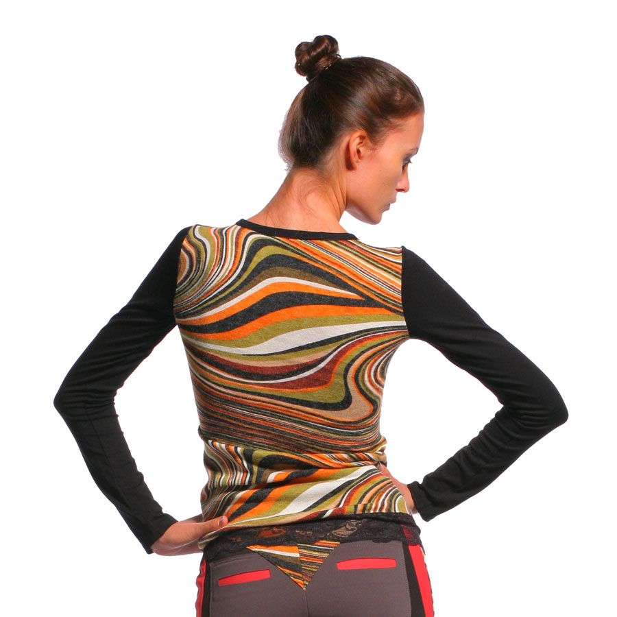Интересное сочетание цвета, оригинальный рисунок, мягкий и приятный к телу трикотаж. Этот джемпер станет одним из самых любимых в Вашем гардеробе. Его можно сочетать как с юбками, так и с брюками, из той же коллекции, которые рекомендуют дизайнеры.