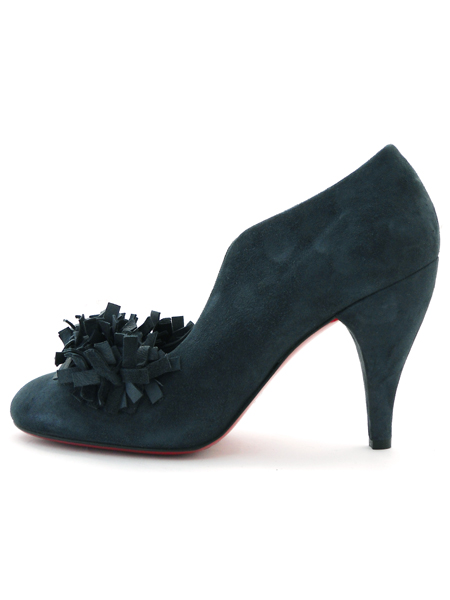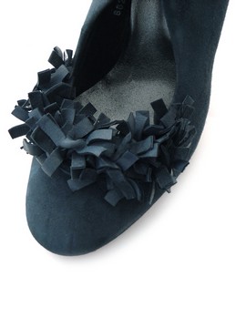 Изящные замшевые туфли цвета морской волны производства Испании сезона 2010. Округлый мыс и удобная колодка делают туфельки незаменимыми как на каждый день, так и на торжественный вечер. Глубокое декольте , украшенное бахромой, напоминающей цветы хризантемы делает туфли очень оригинальными.