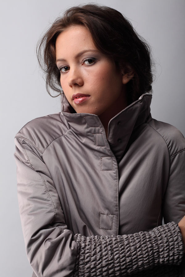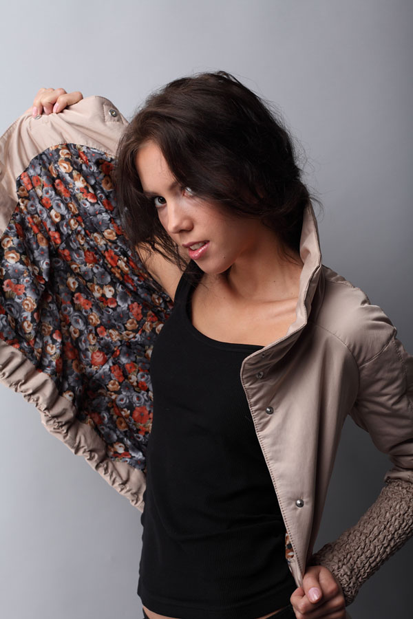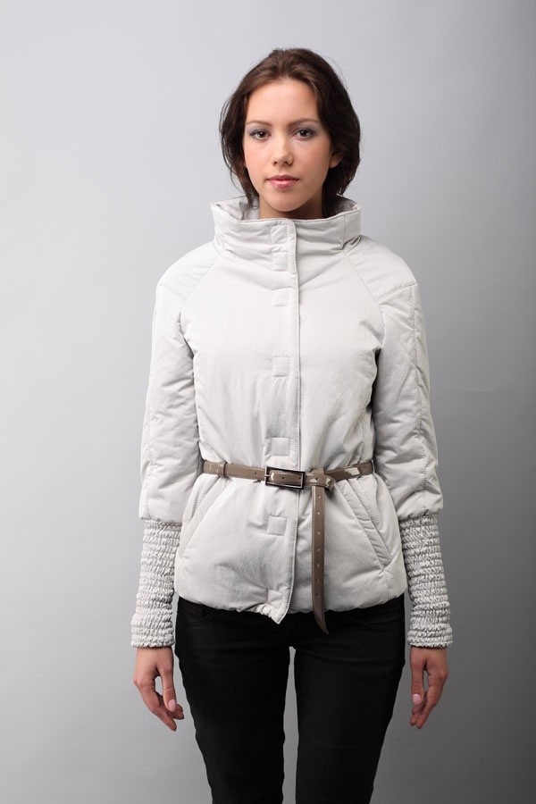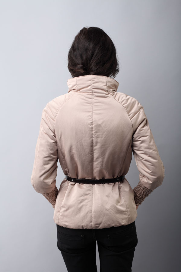 Утепленная женская куртка нежных пастэльных цветов с рукавом "реглан" и контрастным лаковым ремешком.