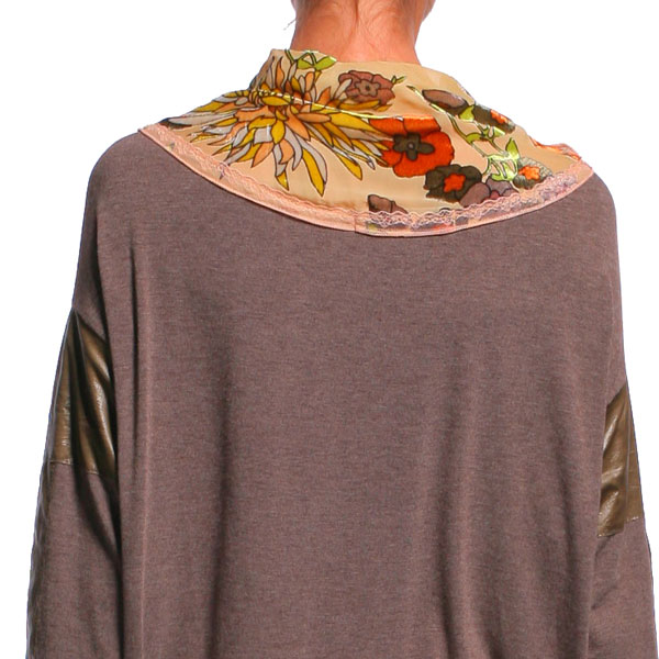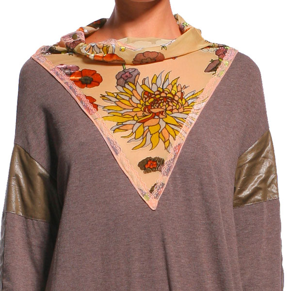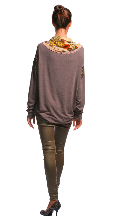 Еще одна бесподобная модель из новой коллекции сезона осень-зима 2010/11 от дизайнерского дуэта "2 сорванные башни". Экстравагантное платье из нежного, мягкого трикотажа благородного серого цвета. Горловина очень интересно декорирована V-образной вставкой с потрясающим цветочным принтом. Длина платья классическая – до колена.