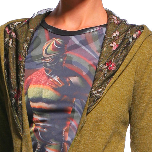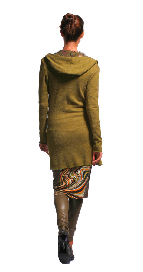 Этот оливковый кардиган с капюшоном станет прекрасным дополнением к вашему гардеробу. Спереди кардиган на поясе завязывается в узел, создавая интересную драпировку.