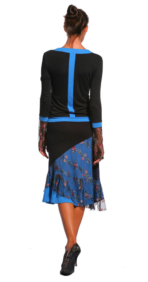 С этой моделью дизайнеры рекомендуют юбку мульти черную с голубыми вставками из этой же коллекции.