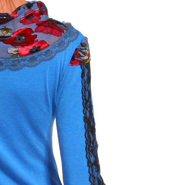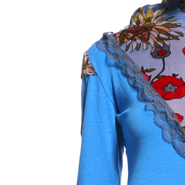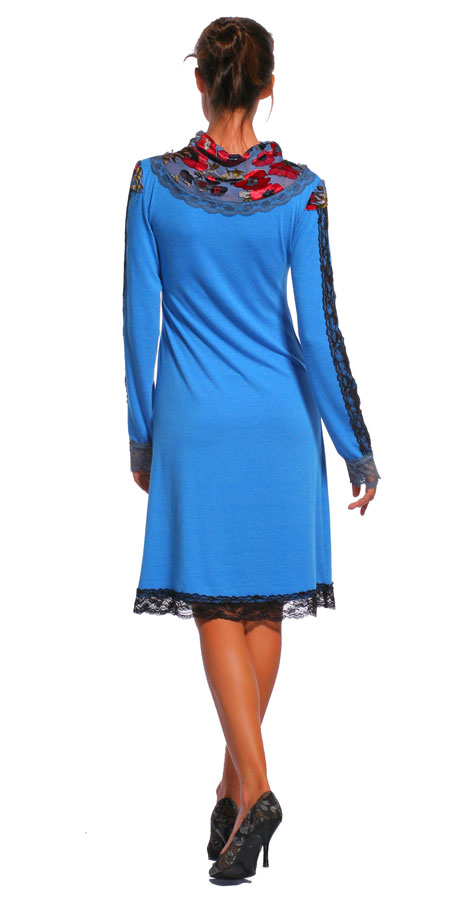 Это восхитительное платье имеет воротник-стойку, V-образную вставку украшенную цветами и длинные рукава, которые продолжаются кружевом. Выполненное из нежнейшего трикотажа эта модель будет очень приятна к телу, и Вы не захотите его больше снимать.