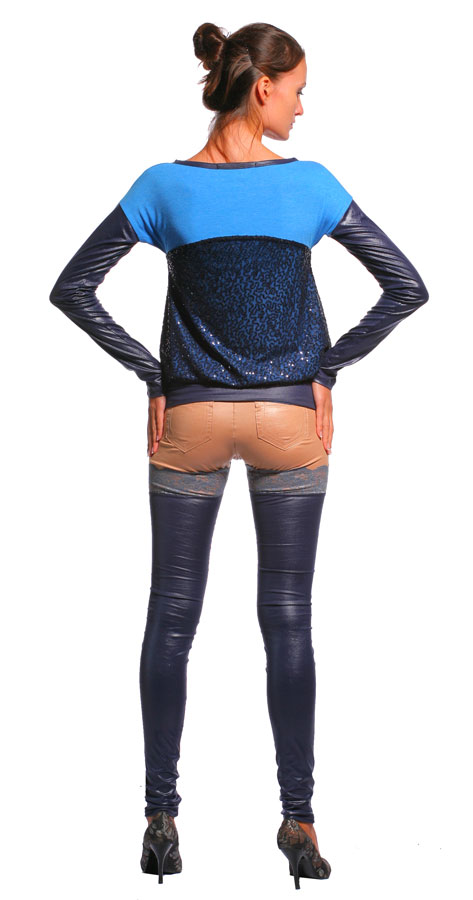 Удивительная ткань с напылением, имитирующая металл, восхитительного глубокого темно-синего цвета очень украшает эту блузу. А небольшая изысканная декоративная капля на горловине привносит некую изюминку в эту модель. Длинные рукава и широкая манжета выполнены из ткани с эффектом кожи.