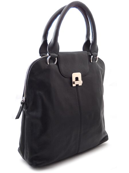 Сделана она из черной кожи приятной бархатистой текстуры. Закрывается аксессуар с помощью большой молнии. Также имеется перекидной клапан, который закрывается на защелку. Завершается ансамбль средней длины кожаными ручками.
