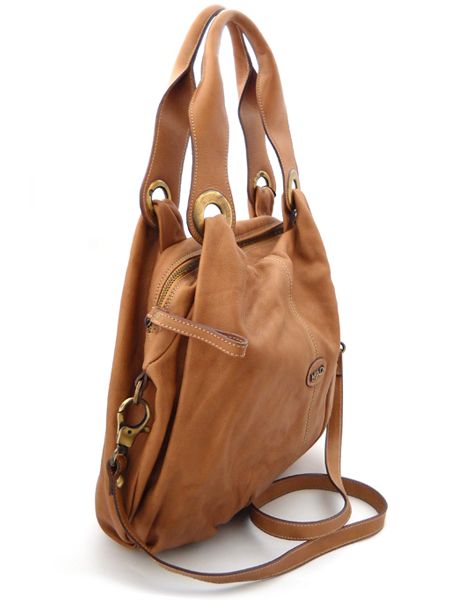 Свободная форма, натуральная кожа цвета карамели, ручки на крупных кольцах из желтого металла — такие детали придают сумке особое изящество.