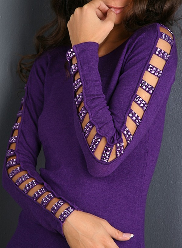 Очень оригинален рукав, своим кроем позволяющий коже красиво контрастировать с фиолетовым цветом свитера. Небольшие поперечные полоски по разрезу рукава украшены стразами. Смотрится нежно и очень эффектно.