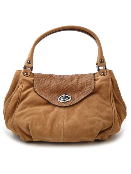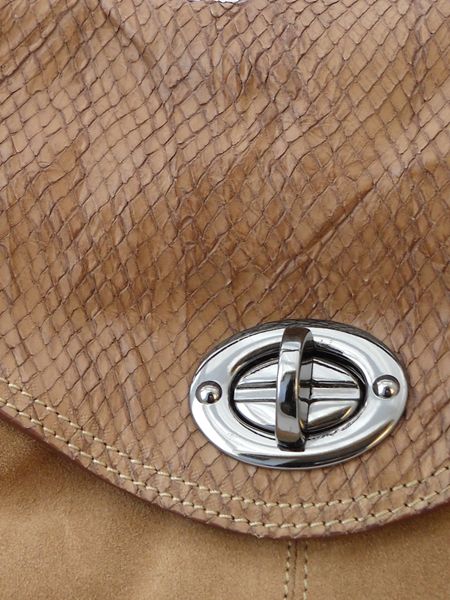 Замшевая сумка роскошного светло-коричневого цвета с отделкой из кожи питона просто создана для богемного ощущения. Изящная и престижная, она прекрасно подойдет для молодой динамичной женщины, желающей выглядеть модно, не отказываясь, в тоже время, от элегантности.